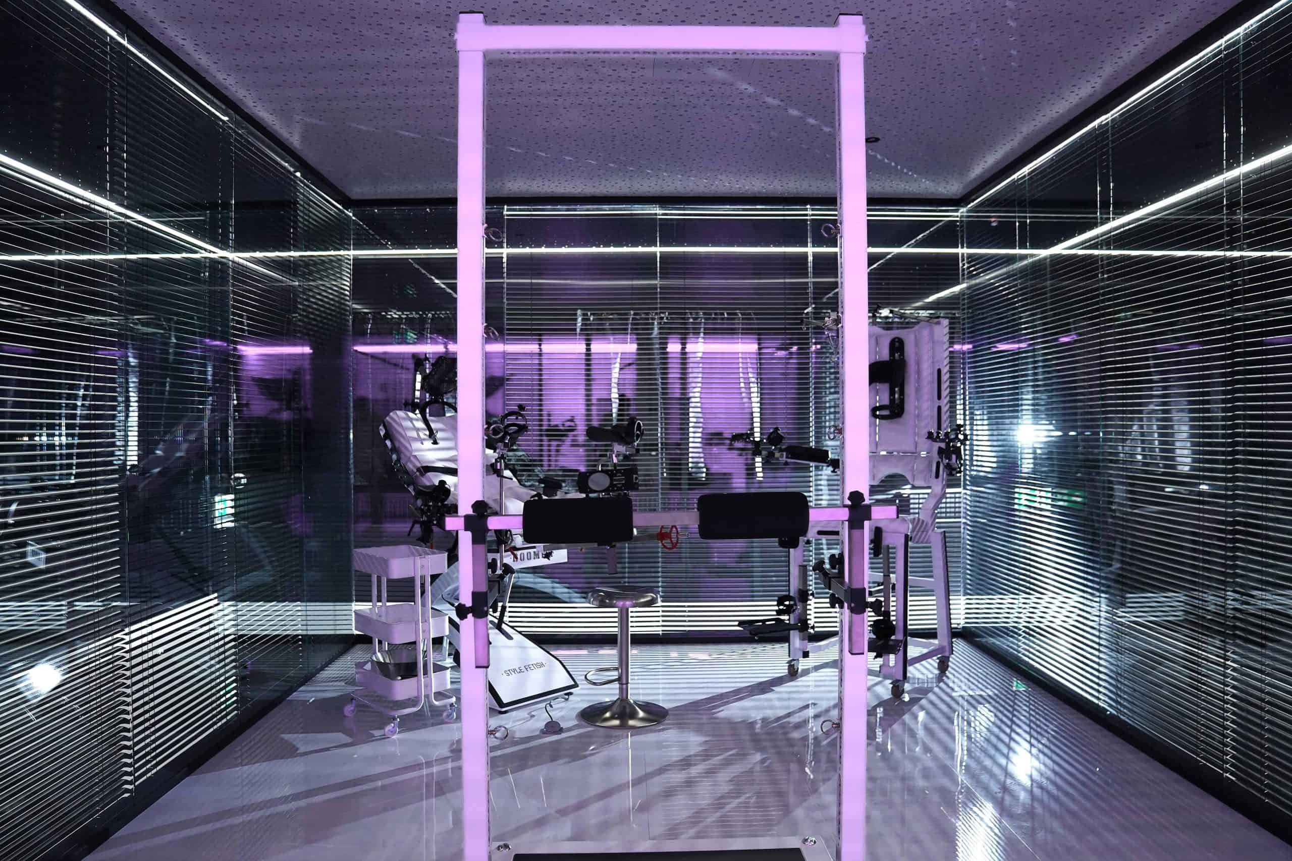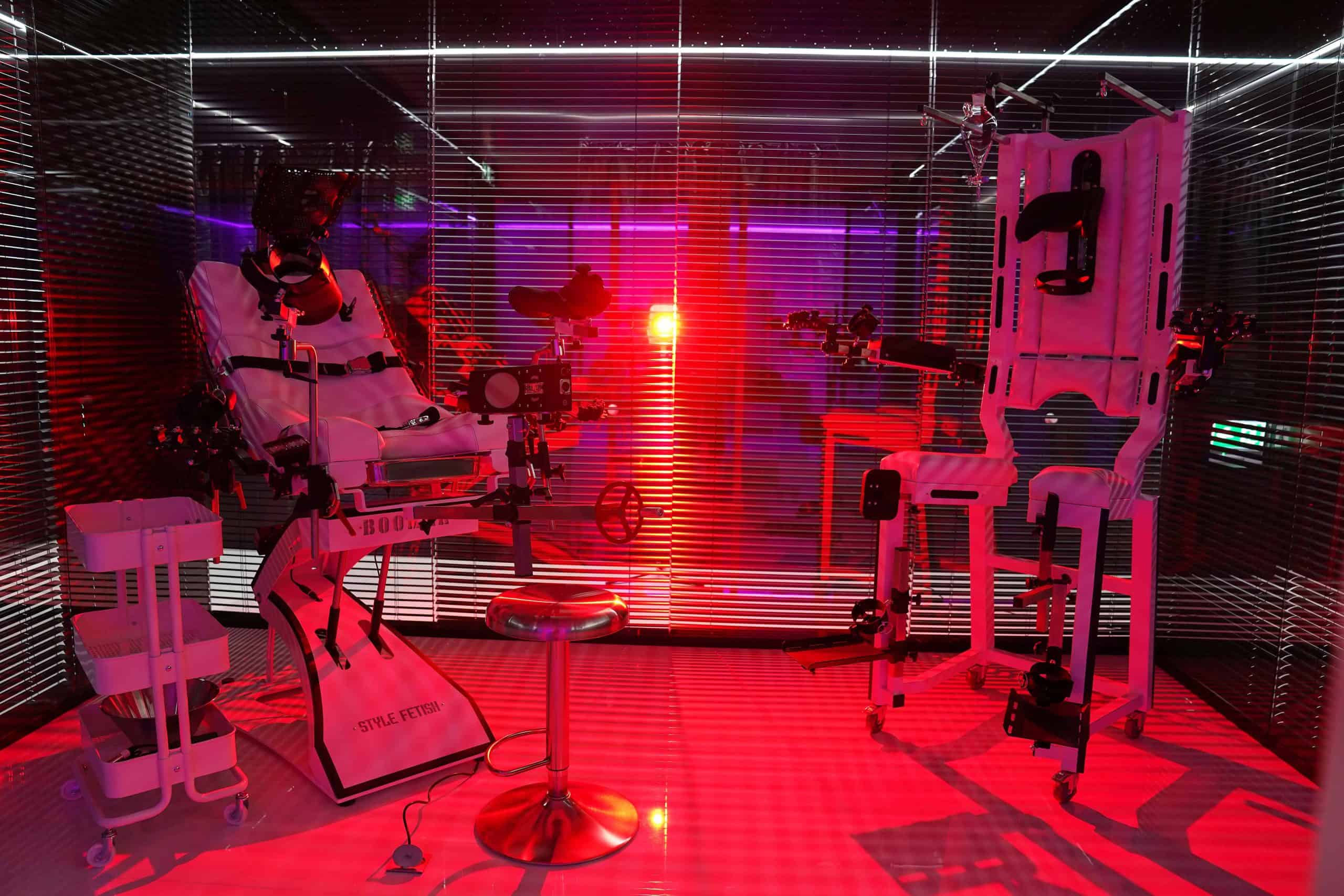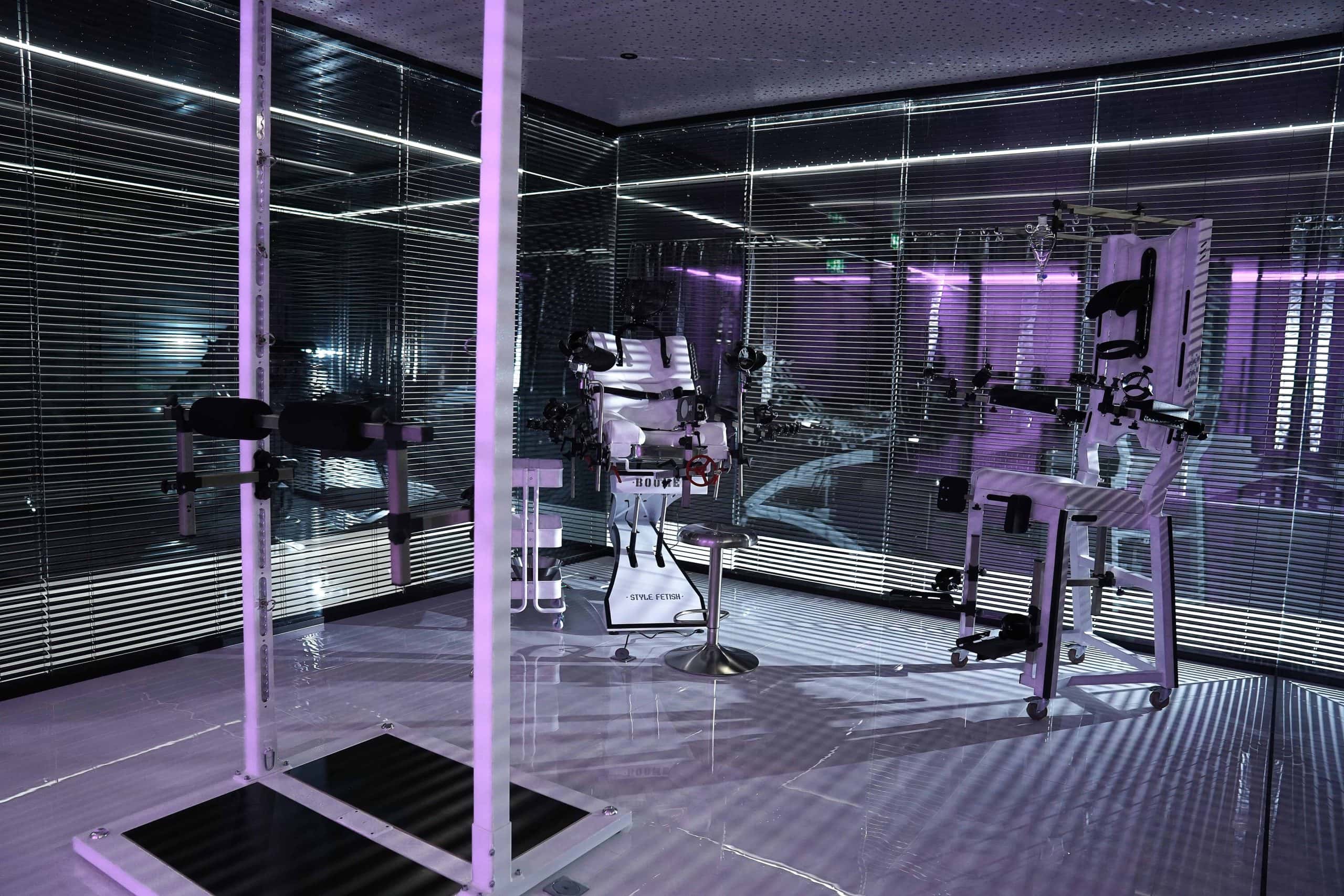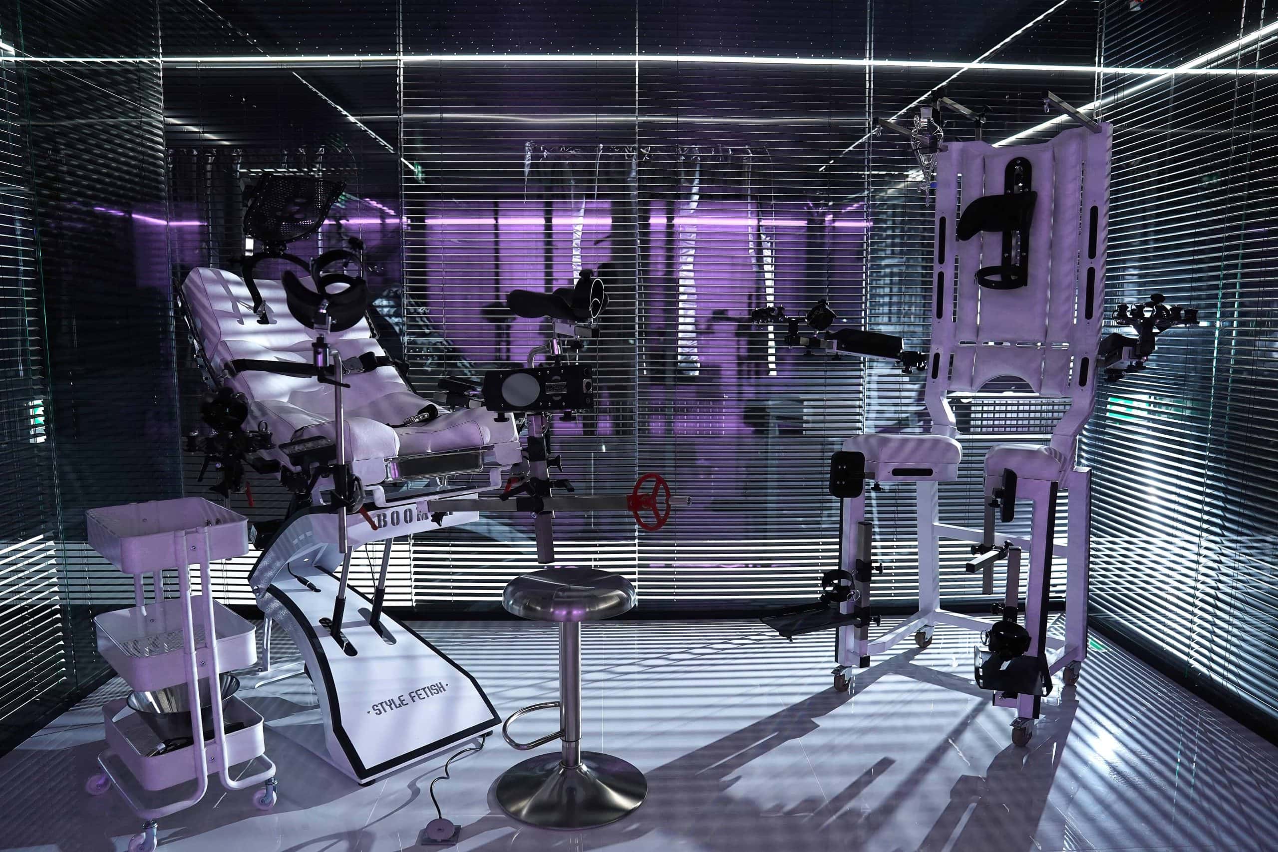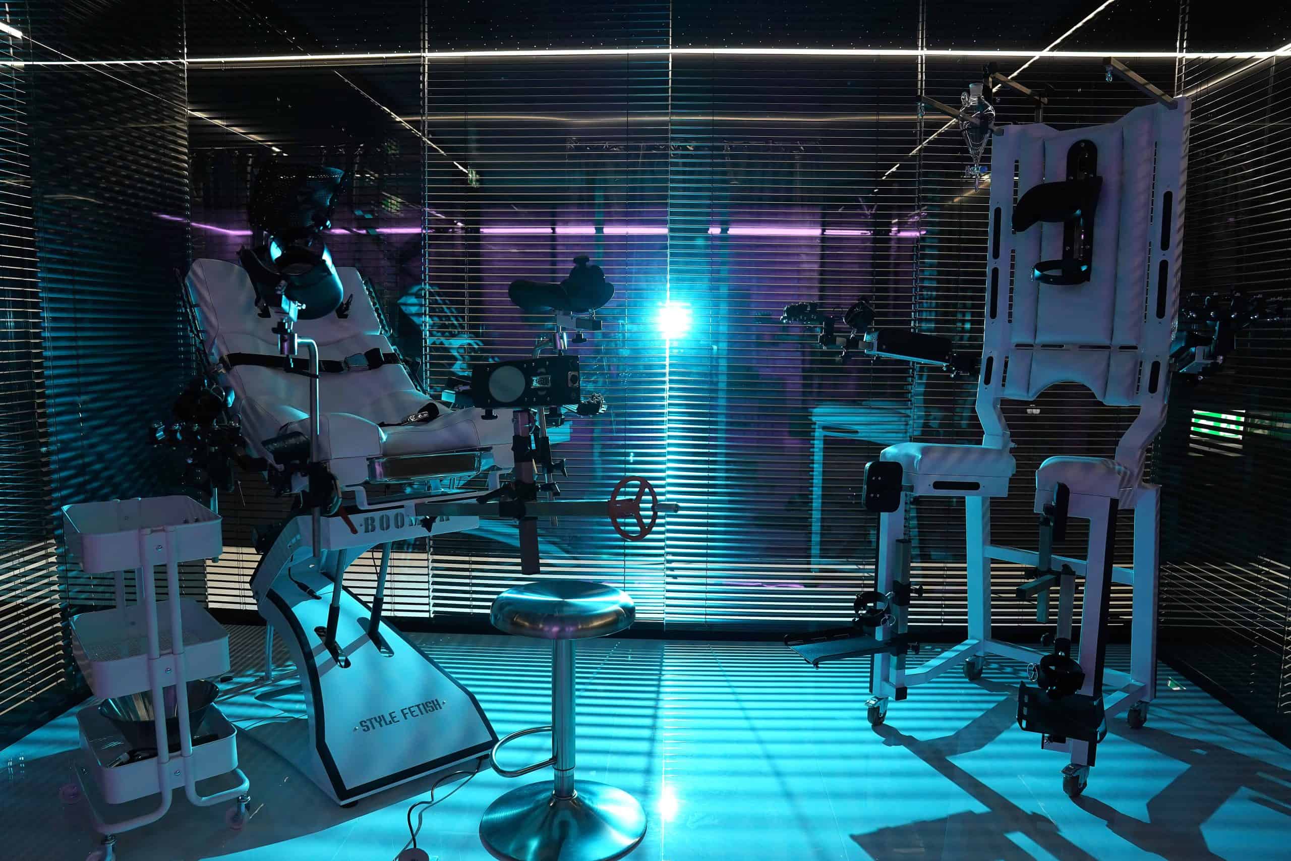 Für die totale Objektivierung und Präsentation spezifischer Körperzonen stehen eine Butt-Box und eine Pussy-Box bereit. Ein Stehpranger, ein Strafbock und ein deckenmontierter Flaschenzug komplettieren das Arsenal der Restriktion.