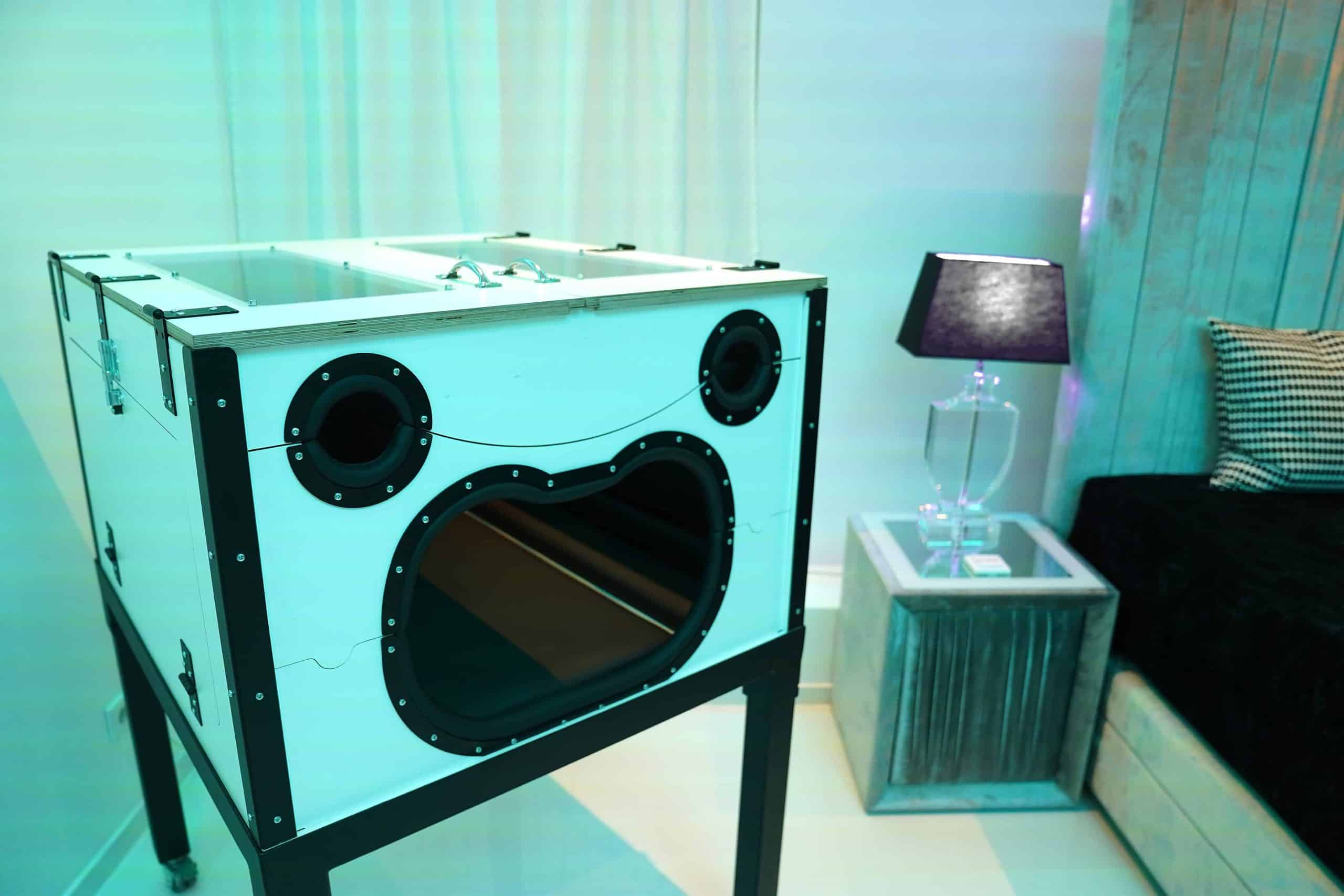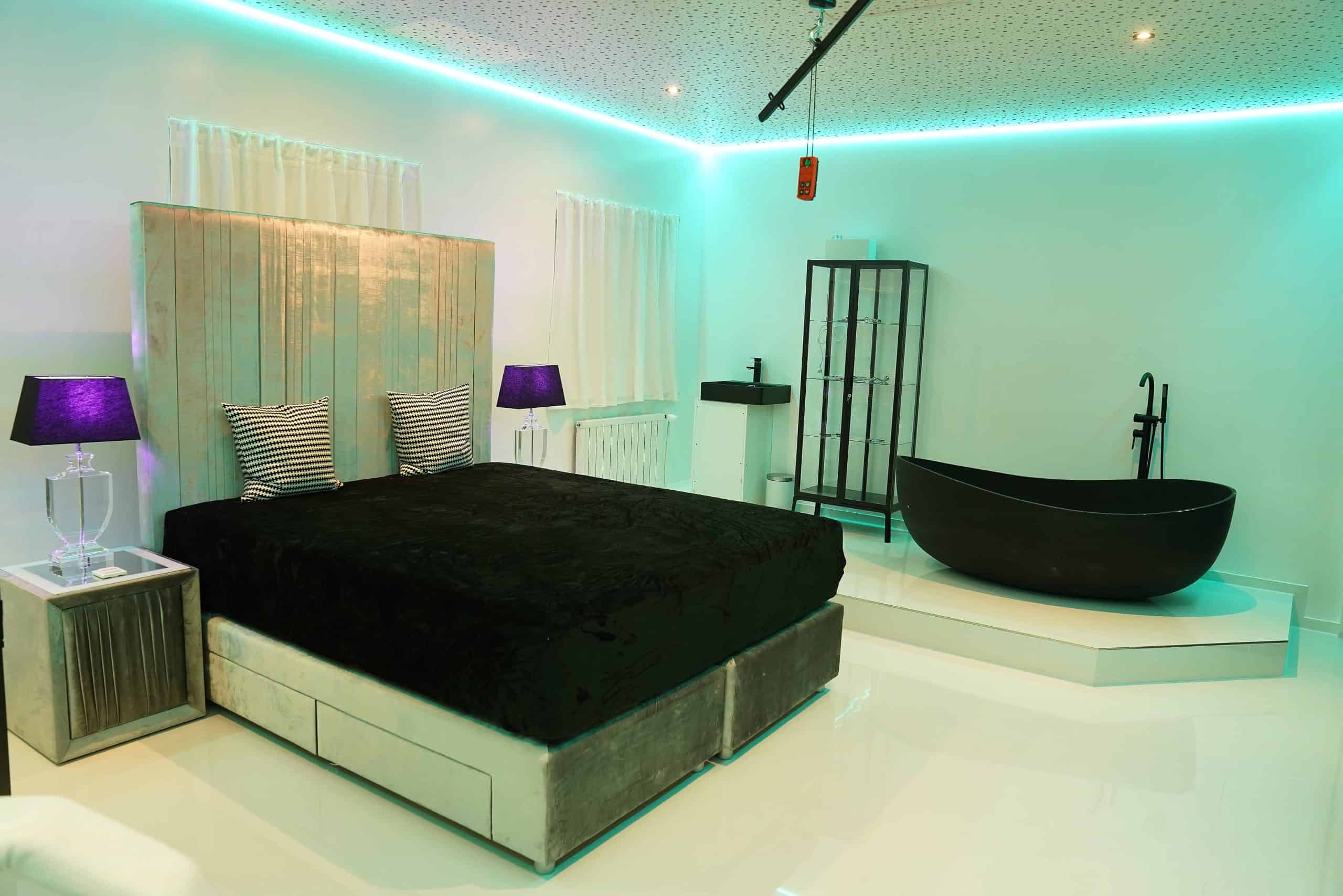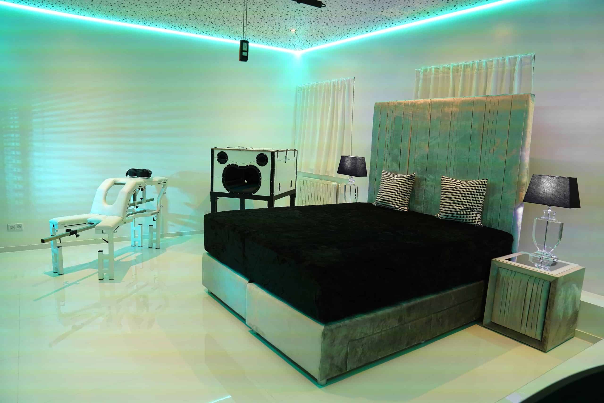 Doch das Glashaus bietet auch Kontraste: Ein komfortables, zentral platziertes Samtbett und eine freistehende, moderne Badewanne laden zur Entspannung oder zu Wet-Spielen in luxuriösem Ambiente ein.