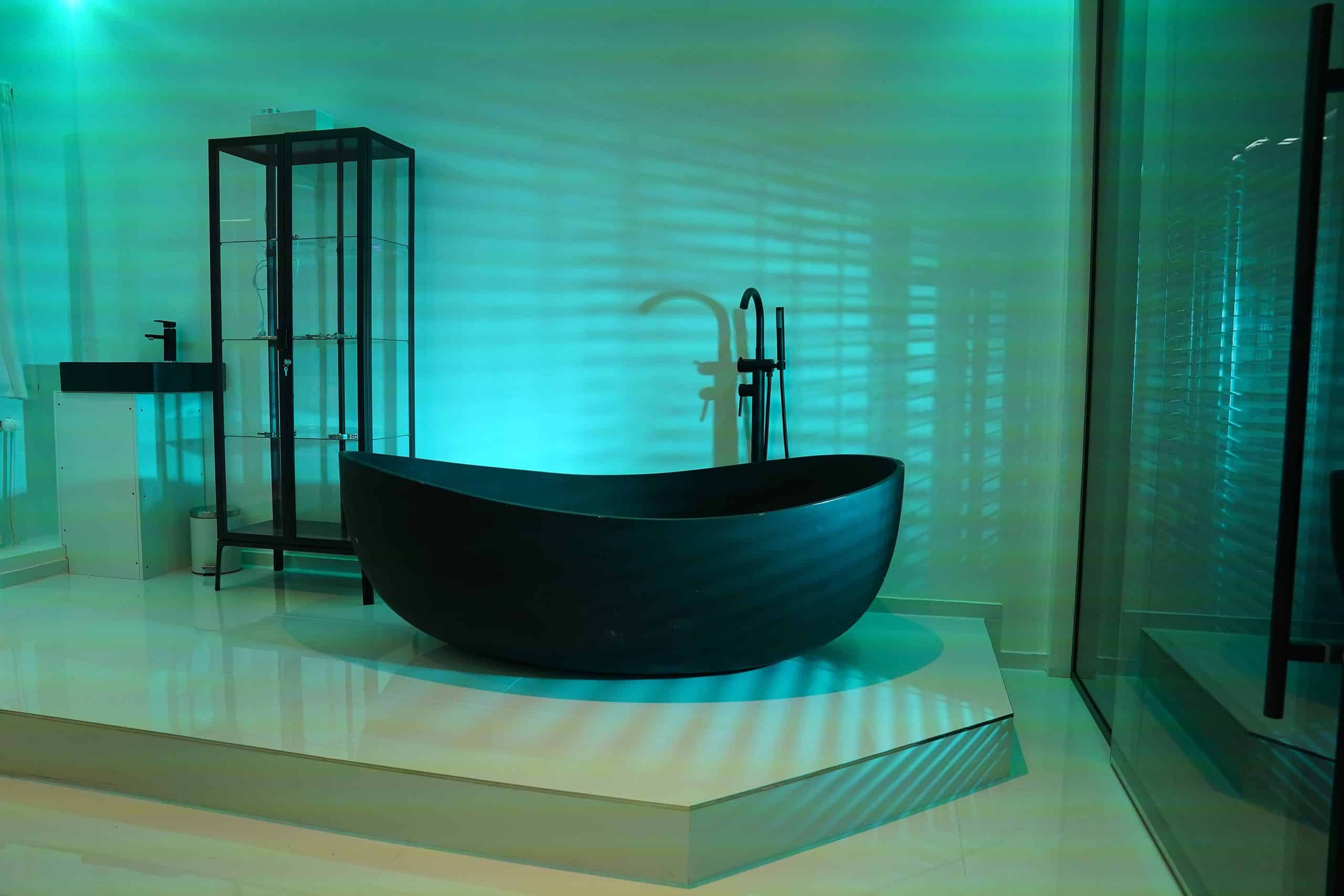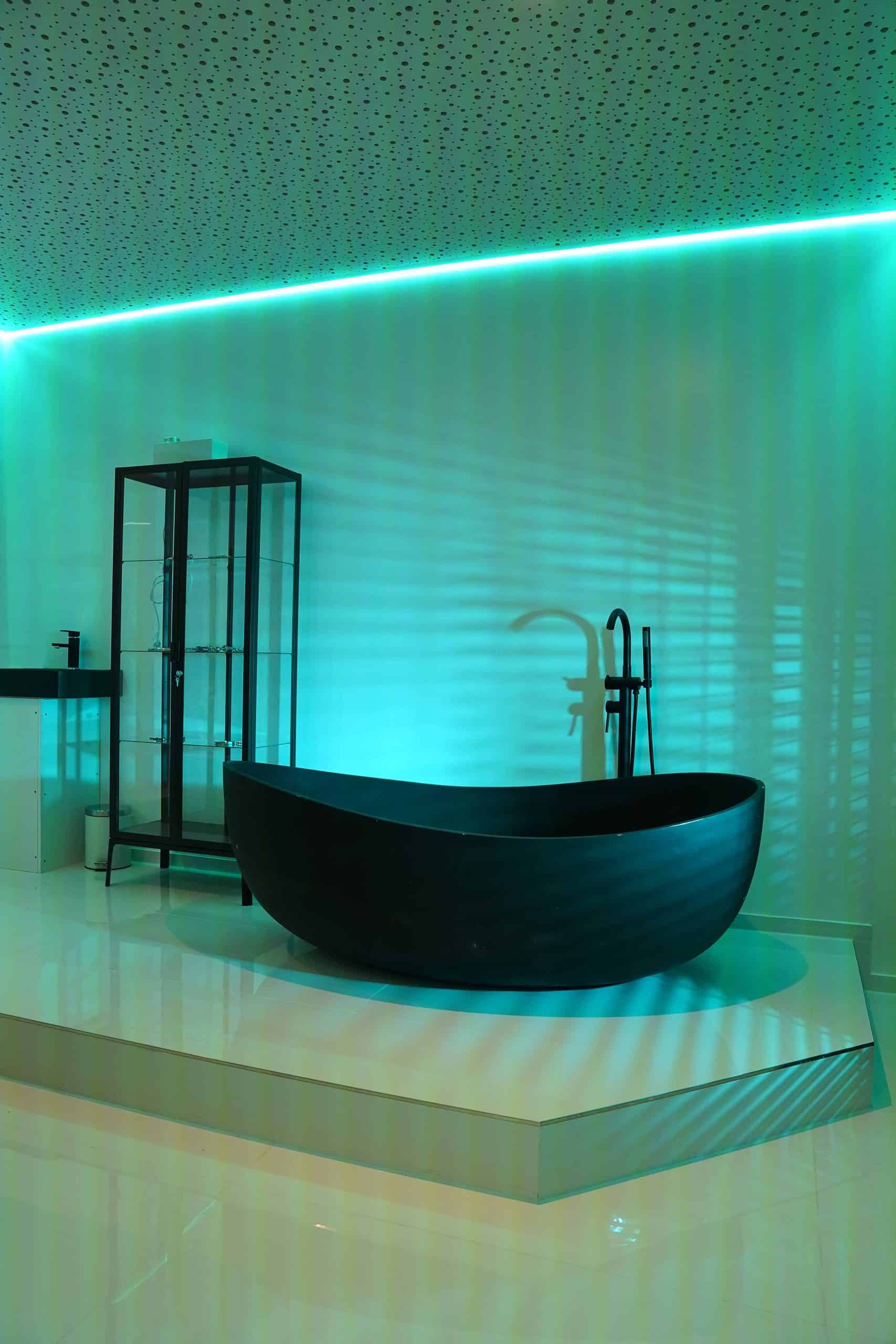 Glas ist das ehrlichste Material, auch bei der Sauberkeit. Der Raum verfügt über ein eigenes Waschbecken und eine freistehende Wanne für Reinigungsrituale.