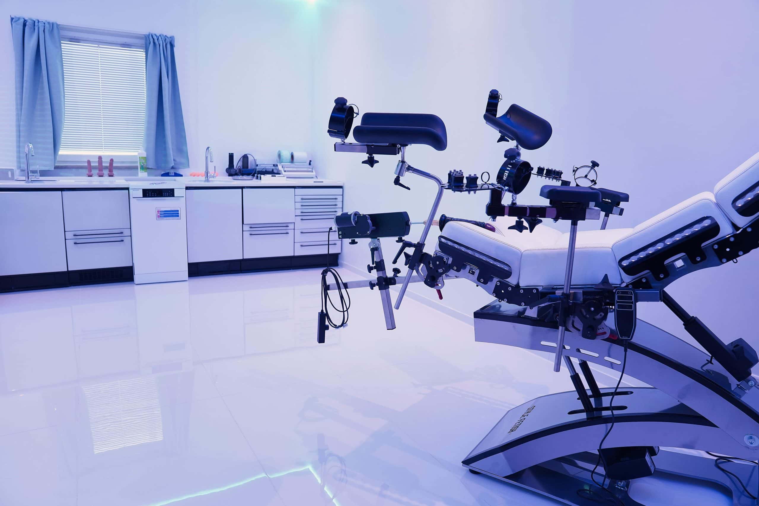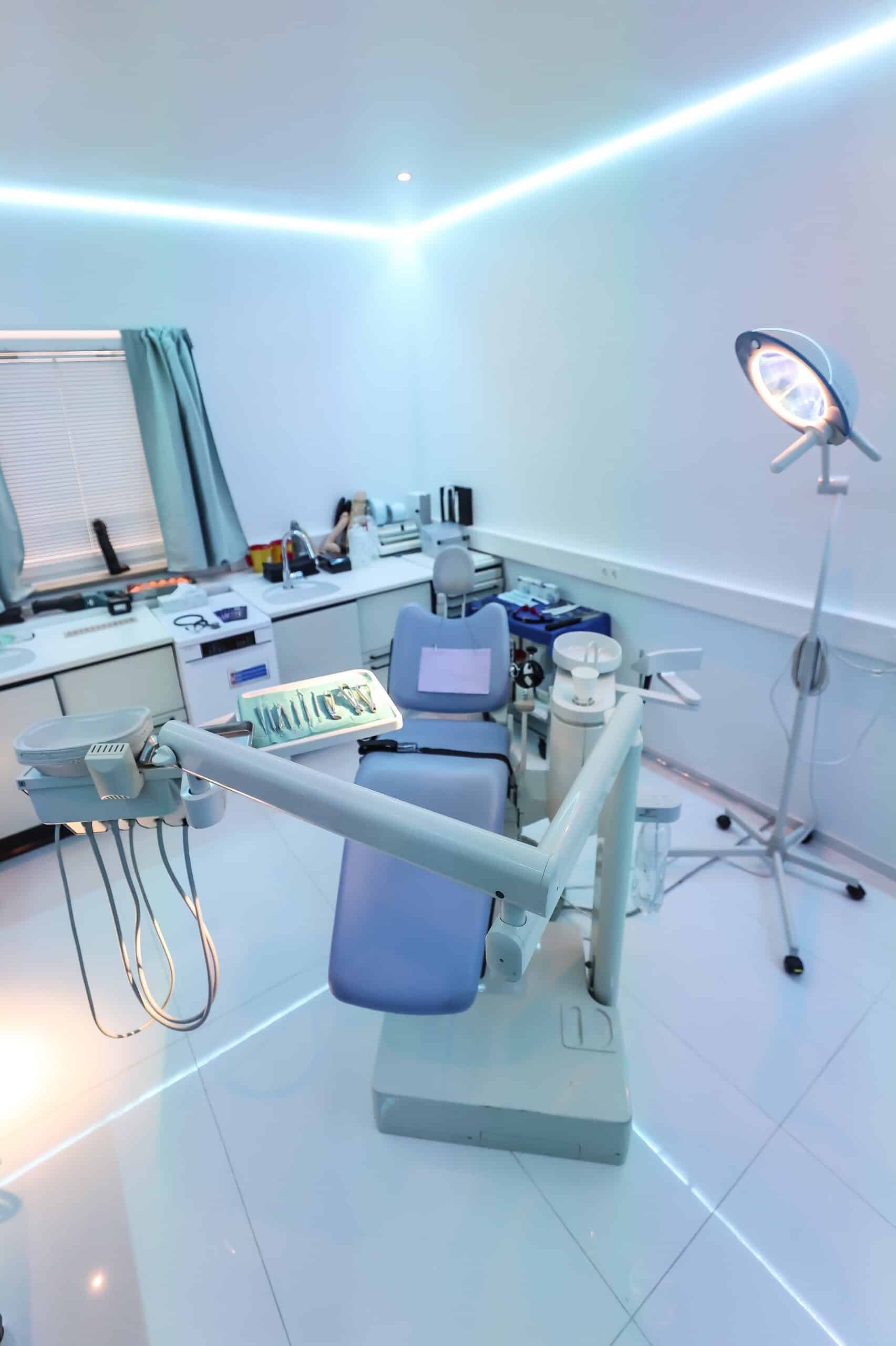 Das unangefochtene Zentrum des Raumes ist der moderne, vollelektrische Zahnarztstuhl. Er lässt sich stufenlos in die perfekte Position fahren, um den “Patienten” optimal zu platzieren und zu fixieren. Die professionelle Leuchte rückt jeden Winkel ins rechte Licht.