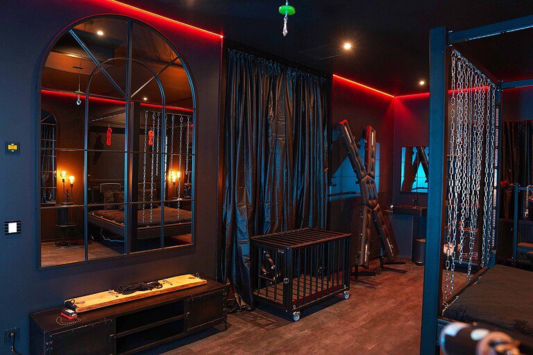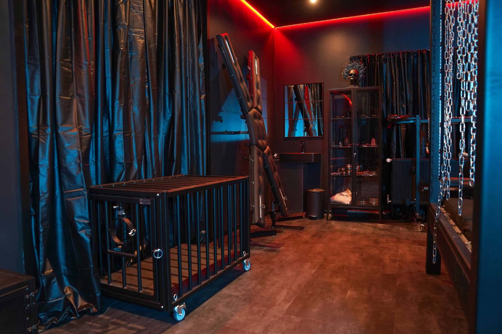 Wer die Isolation sucht, findet seinen Platz im schweren Stahlkäfig. Ein Flaschenzug an der Decke ermöglicht Suspensionen, während die Vitrine mit diversen Peitschen, Ketten und Karabinerhaken das nötige Werkzeug für Ihre Zeremonie bereithält.