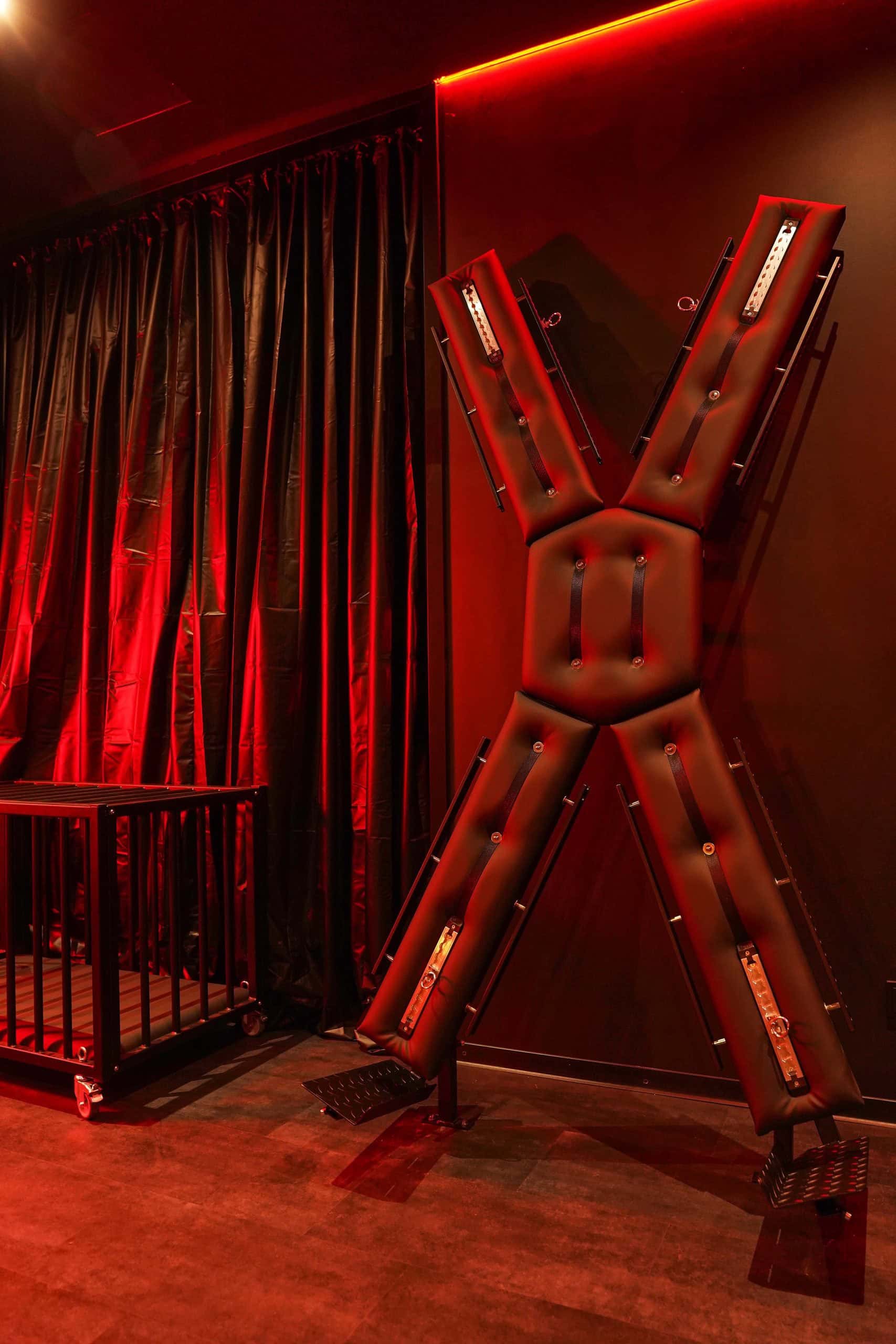 Das Instrumentarium der Züchtigung ist umfangreich: Ein klassisches Andreaskreuz für die Kreuzigungsszene, ein elektrischer Strafbock für intensive Reize und ein System-Pranger mit wechselbaren Aufsätzen lassen keine Wünsche offen.